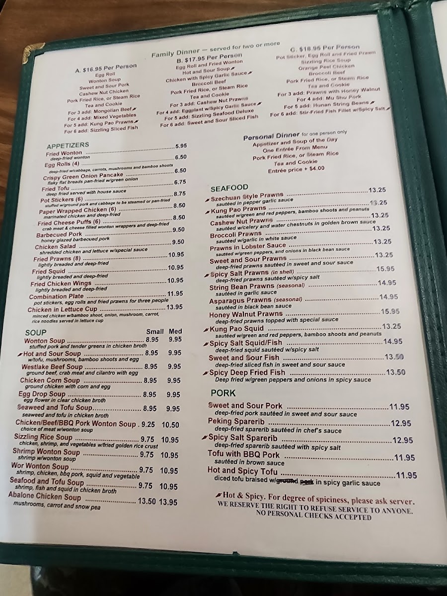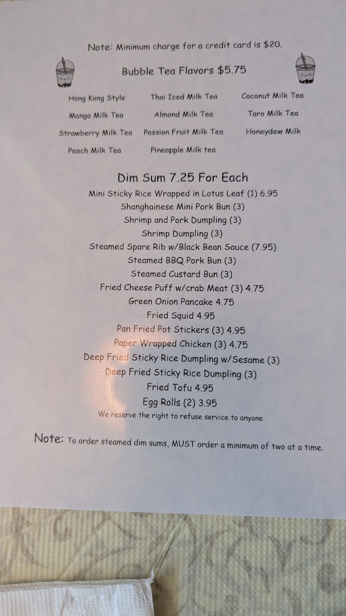 In addition to main courses, the menu includes various appetizers and side dishes commonly found in Chinese dining, such as dim sum selections, pot stickers, fried wontons, and egg drop or chicken corn soups. Combination fried rice and noodles, including seafood chow mein and Hong Kong style noodles, offer further options for complete meals.