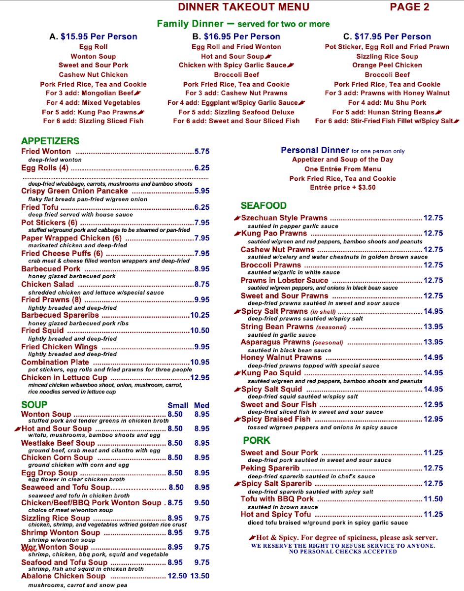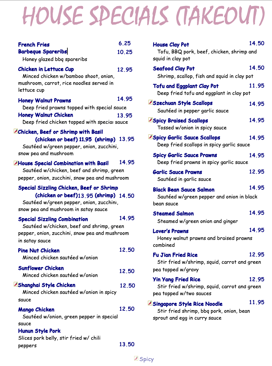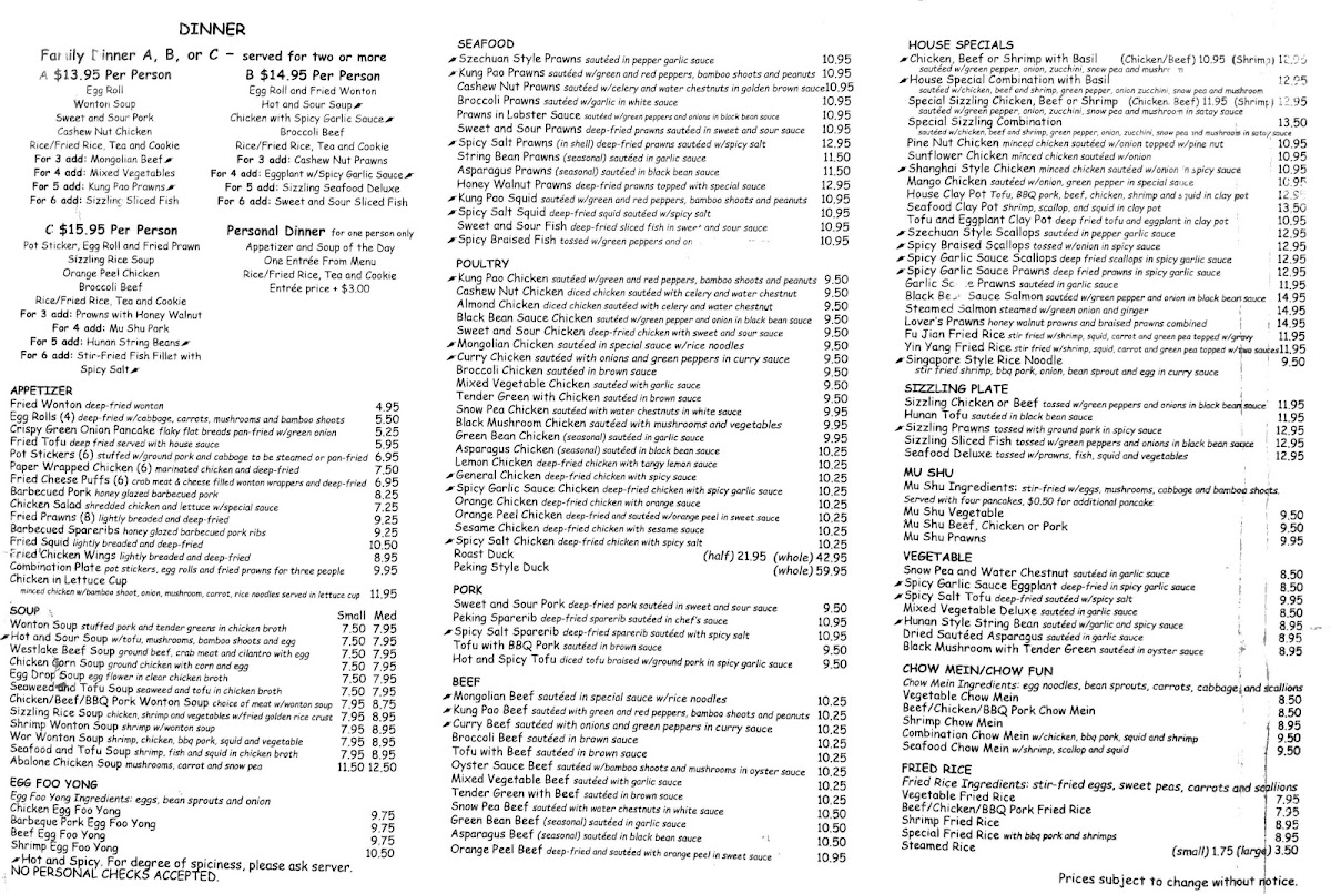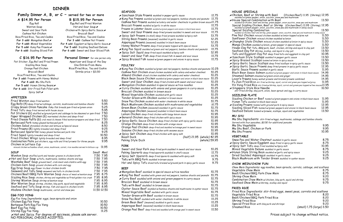 The menu at Hong Kong Garden features a diverse selection of Chinese cuisine organized across multiple categories to accommodate various dining preferences throughout the day. Patrons can choose from lunch and dinner options that highlight traditional and contemporary Chinese dishes.